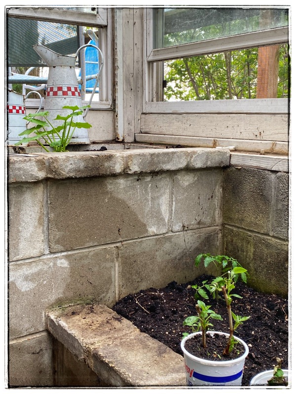 In the winter the little glass house becomes a heat sink and I leave the door to the house open to absorb the warmth. In the summer that inside door is closed to keep the heat out of the house. So even with windows open it is going to get pretty hot in there. However, as long as I water daily, keep the windows open and have a fan going (to keep the air moving) I have high hopes.
