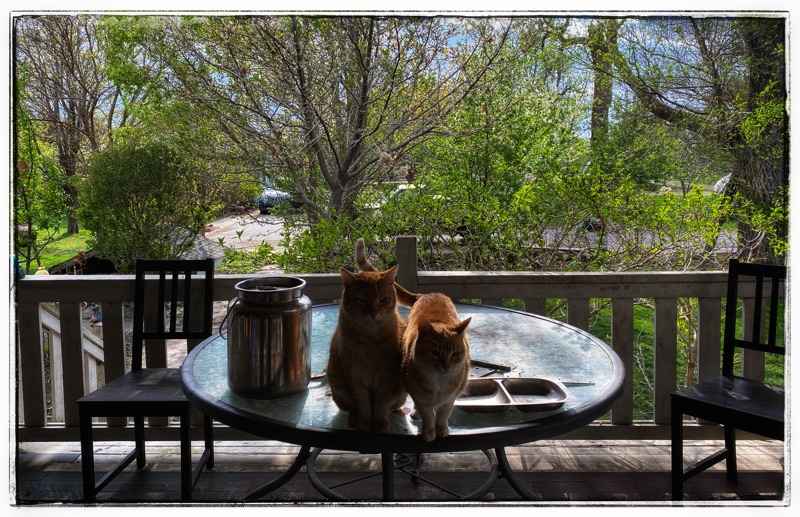 two orange cats sitting on verandah table with spring growth on trees behind.
