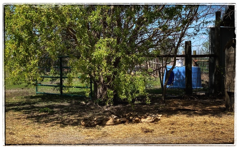 The wind yesterday was coming out of the West so the Big Pigs set up camp in the shelter of their water tank. Do you see how their ears have popped up when they hear me approach. Just the ears mind you. At this point they are saying a gentle hullo in their deep piggy grunt. I always grunt back and we have a little “I see you” conversation – though they are too comfy to get up!