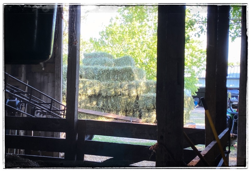 bales of hay on a hay rack seen through the open barn