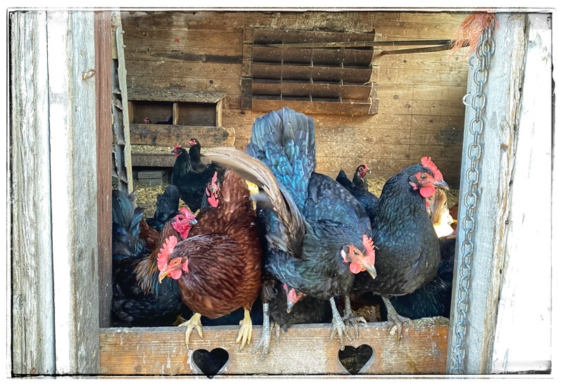 Chickens leaving the chicken shed in the afternoon.
