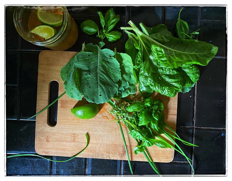 My dinner was: Greens, weeds. Zuchinni. Young onions. Meatballs and boiled eggs.