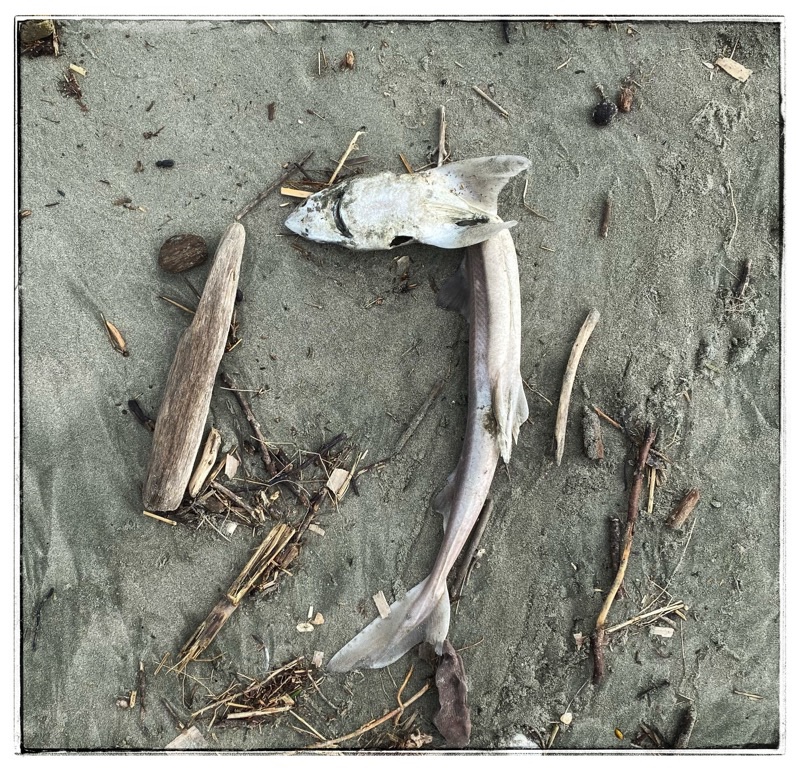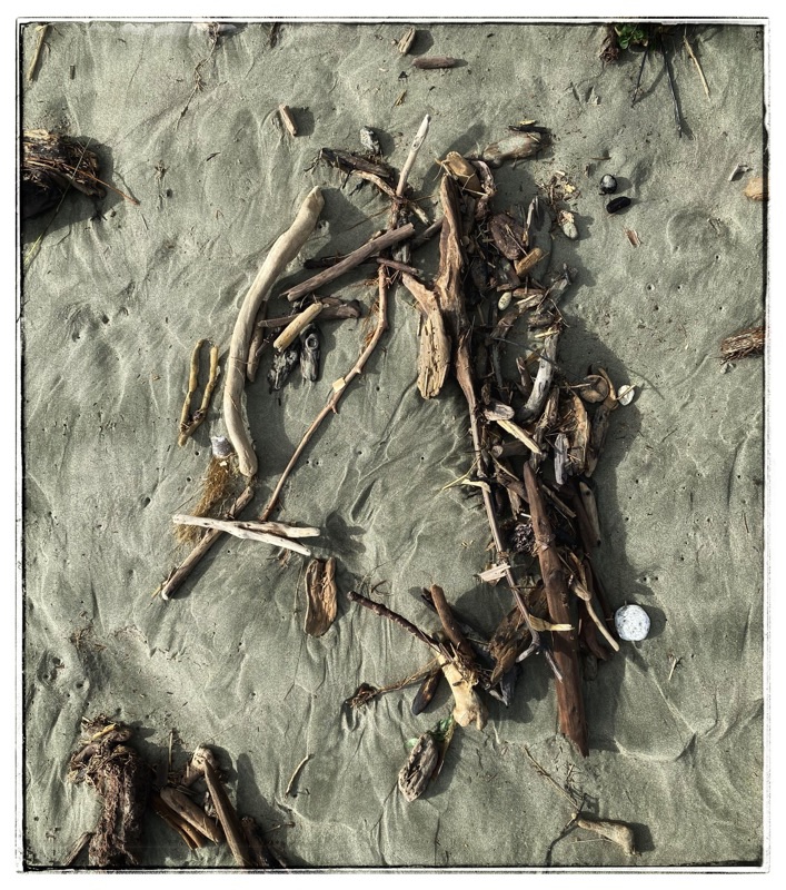 The beach art has changed again. Like I said yesterday. Every day the beach brings us different art. Yesterday there were lots of pine cones, dead fish and big animal bones.