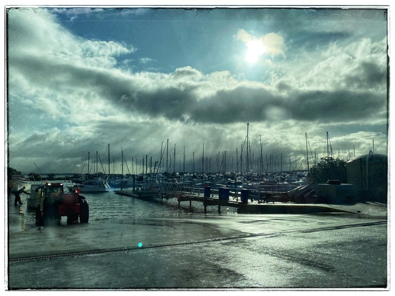 He is pulling it out to give the hull a bit of a clean – so we went down to get it ready to be hauled up and dropped (gently) into a cradle.