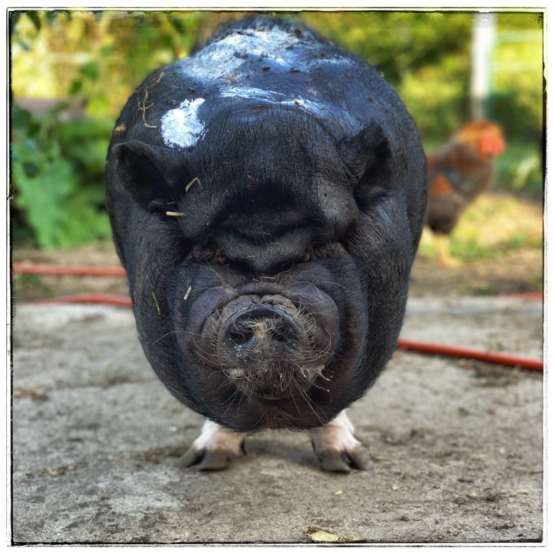 Wai is an imposing pig, war wounds notwithstanding. I think he’s entitled to be a bit morose and antisocial, considering his background. I expect there’s more than a bit of PTSD. And that tongue noise? It’s called a dental click.