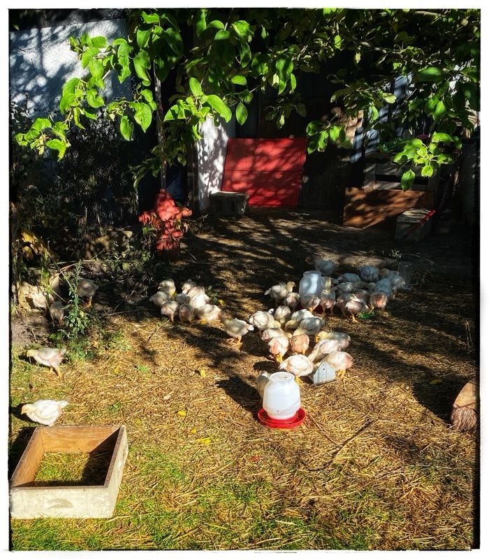 Usually I get back from bedtime in Town after dark, then launch straight into chores, (this is the best weight loss program ever!), so last night I swept all the chicks inside and locked them in until dawn. They were bouncing out as fast as I got them in but eventually I was able to close the door. They are all fine and good this morning.