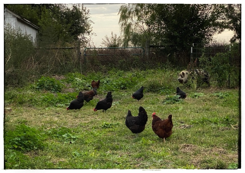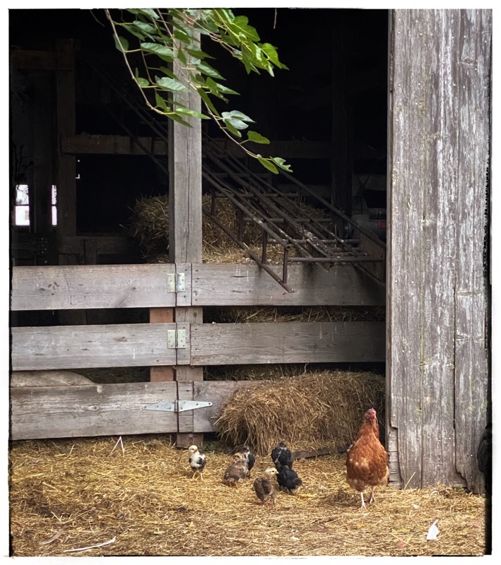 This hen is getting her brood closer to the chicken hospital where I hope to catch this lot. I need them in the hen house for the winter. To date I have not been around often enough to corral them and the hawks are picking off the babies.