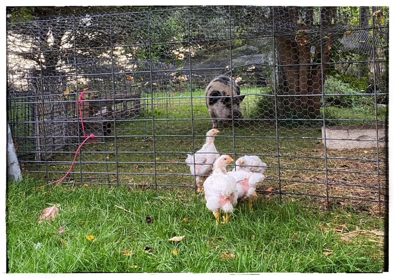 But while I was in Town she found a gate that had not been fixed and released herself to rummage about in the White Chicks pen. Breaking in there is not difficult for a big heavy pig who steams forth like an ocean liner and she managed to release a bunch of chickens at the same time.