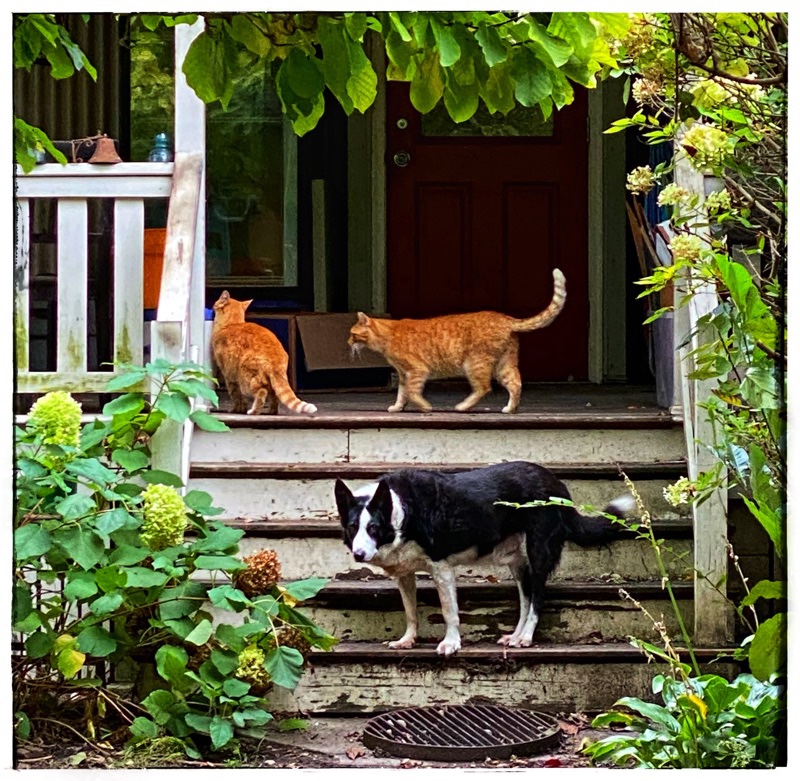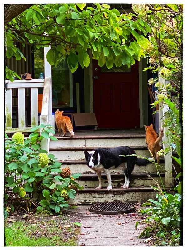 WaiWai stood under the hydrangeas because he does not do steps and the lawns were covered in chickens of various descriptions. Big Jude and FreeBee thundered back up from way down the back of their field.