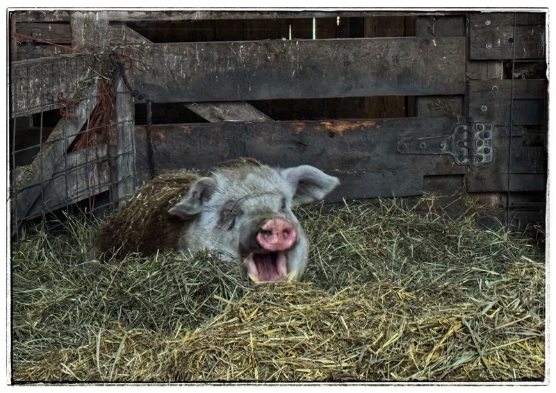 Can you see the two cows on one side of the gate and FreeBee on the other. FreeBee often sleeps by this gate. Sharing the bovine warmth I think.