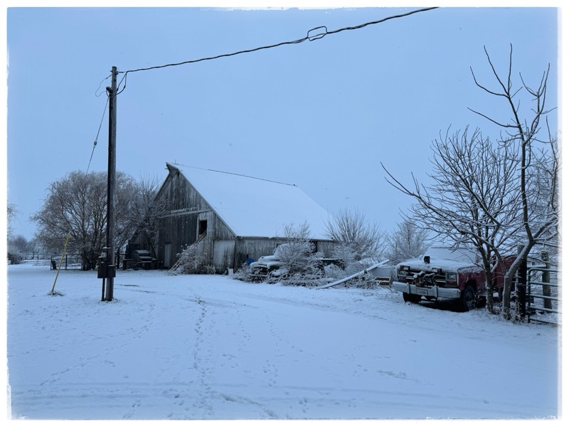 8. We are predicted to get 6-11″ wet heavy heart attack snow throughout the day tomorrow. It thereby squashes my wishful thinking of a snowless winter and caused me to have to do the very unfun job of installing the tire chains on the skid steer this afternoon as well as hook up the auxiliary hydraulics. This is all very hard on arthritic hands so I spent the next hour sitting in my comfy chair with a lap robe feeling sorry for myself. Now they’re saying another biggy likely Friday and Saturday. Bah humbug.