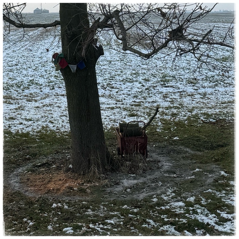Dear Tree has had that big loose limb removed. She is wearing the Tibetan flags that Diane sent me a thousand years ago (they usually fly out the front) and I circled her with ash (which in hindsight may have been a little insensitive) and soothing words. Even though we are in the dead of winter, and I warned her, I still think it will have been a shock for the tree.