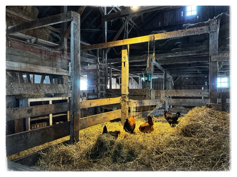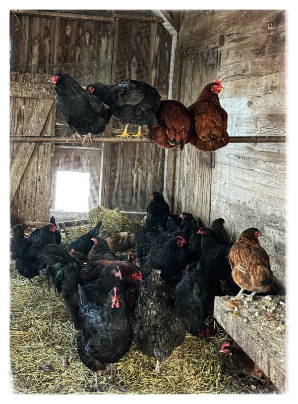 In the cold the chickens prefer to huddle together on the ground in the deep bedding.