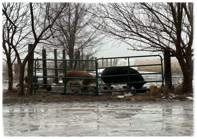 With the warm-up, FreeBee is a new hog. He has gone from lying on his side in the straw refusing food and wishing for a painless death to standing at the gate yelling at me to hurry up with that bucket. That pig just hates cold. I know this about him now so I don’t worry.