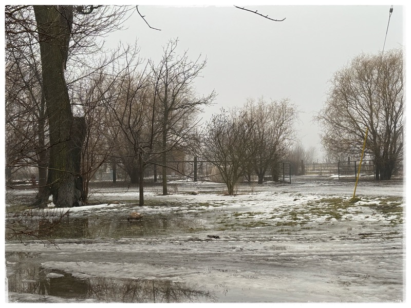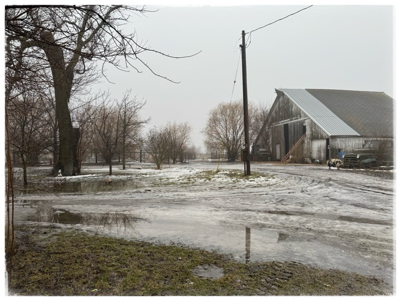 5. At first glance the photos portray the real misery time of the year, but then on looking longer they become quite beautiful, the barn the dark bare trees, the shiny silvery polished & molded ice. I once made a watercolor painting of such an icy puddled road passing before a beautiful old farm & its Victorian pile farmhouse, lined with gray rock fences & bare black dripping trees just outside my Kentucky home town. I called it “January Thaw.” For touches of color here& there were just a few little dark red dried berries showing in weeds along the road, otherwise all grays, blacks, white & silvery puddles. I thought it was a beautiful painting & time of year. I lived then in subtropical South Florida & sold it there (maybe to another another soul missing just such a day & place. Anyway, I always knew I couldn’t live on a sailboat & go round the world on it or ever make a speedy, spare get-away on a horse. I am too attached to my stuff & would never be able to choose just a few of the precious items collected during my long lifetime. And I would need art supplies (larger & more cumbersome than chef’s knives). I am of a different nature, more like Him Inside by the fire. I need my old wingback chair, my books & belongings & family & friends & pets close around me. Long, long ago I longed to vagabond & go off globe-trotting, but I never got away for long & always headed home, wherever that was, where my true heart belonged. My father died when I was 11 & we moved to Chicago not long after & that Robert Louis Stevenson poem came up with its sad parting from a farm “Goodbye to” old apple tree, swing, to barn loft…etc., “Goodbye, Goodbye to Everything.” I really don’t like Goodbyes. Or leaving, or Homesickness.