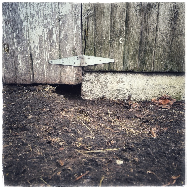 I have been keeping the chickens in the henhouse the last few days. And feeding and watching them in there. And I have gotten four eggs a day. But look at this hole in the door. Dug last night.