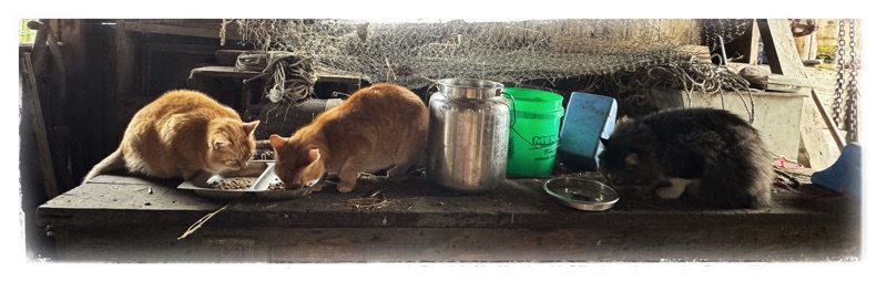 How impressive is 3rd son! He is a talented man. Three cats eating together. I suppose black cat is still in the rafters, not ready to join in.