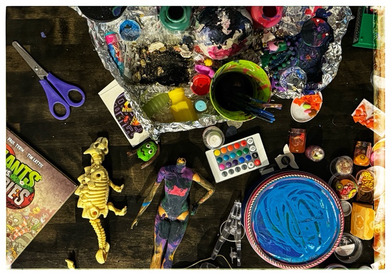 The artwork was all over the dining table when I arrived. And – of course- it is still there but look at all that plastic!