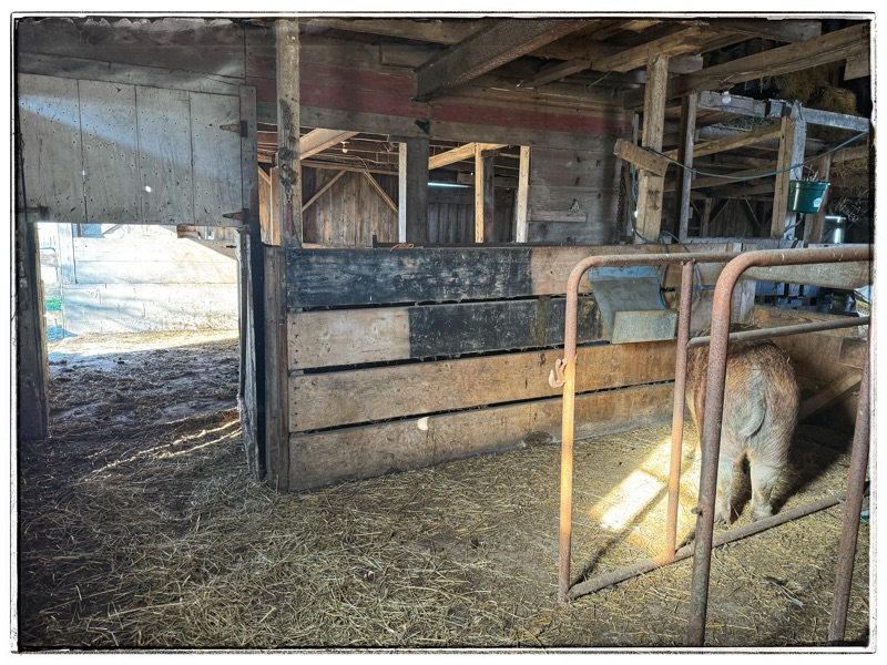 The milking room has a low wall for Him Inside to pop FreeBees food over. It has to be easy or John won’t do it. Running a farm is like chess – every decision has to be examined with the next steps in mind, taking into consideration consequences and wild cards and the other players. Presently I am folding my annual tour (starting in two weeks) into every decision. There are a lot of moving parts (and moving animals) – but at this point I see no problem with FreeBee staying on that side of the barn while I am away.