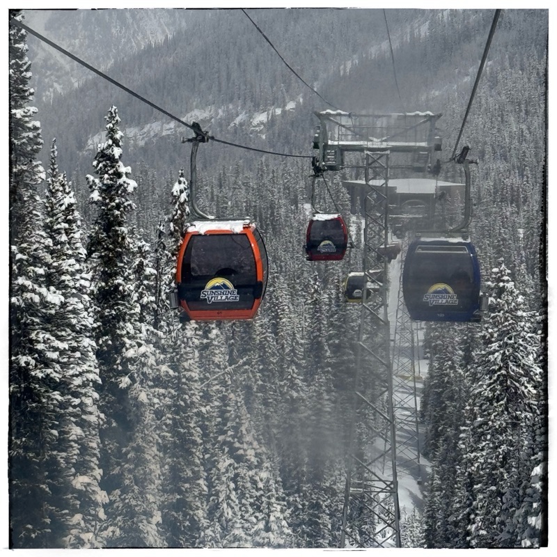 The gondolas are small boxes, brightly colored, roped together like Christmas lights rising with stoic determination up the white snow dressed hill. They sway up and down the mountain from 8 – 6pm most days. Sometimes later. And never rest. They wait for us at the top of the carpark.