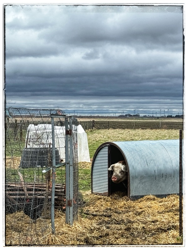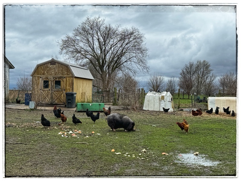 Wet but well. This cold cannot last. Though I fear we are in for a wet summer. And I am leaving the cows in the field with the big pigs until I get back. I want to give those two other fields a good beginning. Try and smother some thistle growth.
