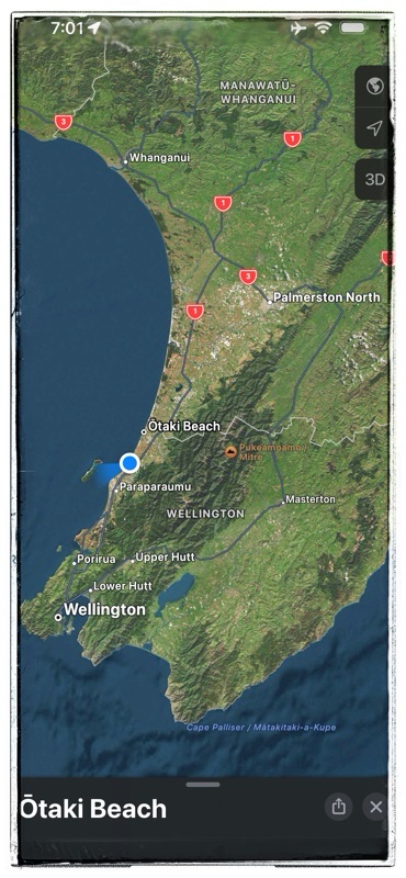The blue dot is where I am this morning – and this afternoon we will be toddling up to Ōtaki Beach. There we will be joined by more family and old friends.