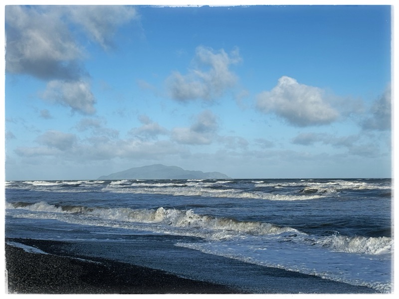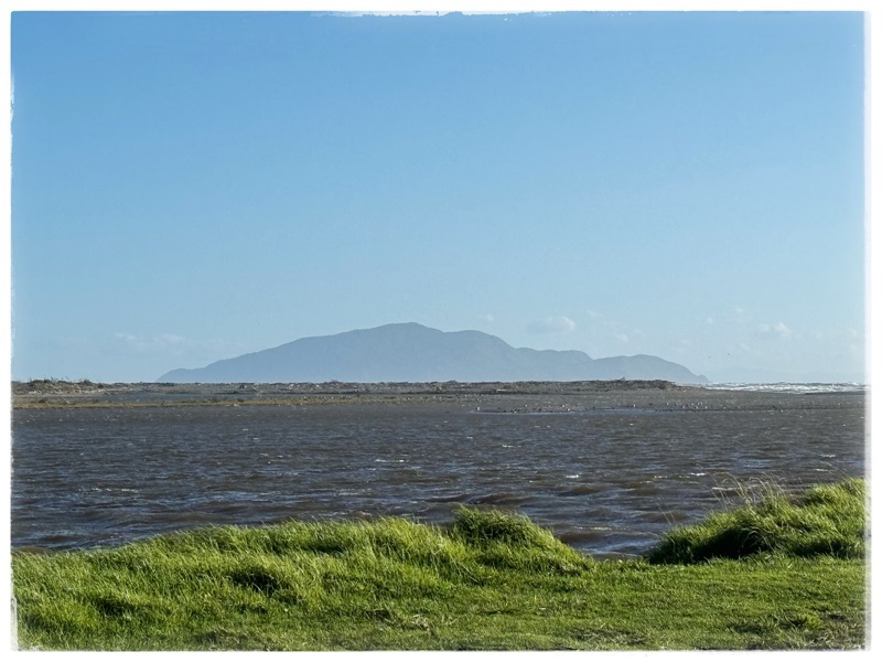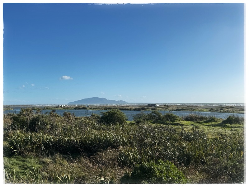 Looking from land across a river across another spit of land out to sea then over to Kapiti Island makes our brains work to make sense of it.