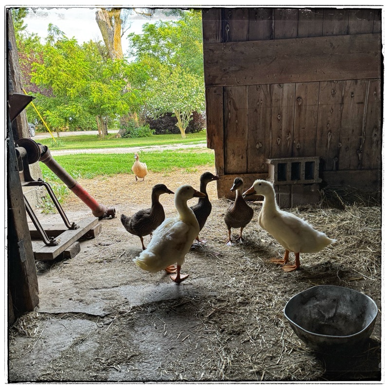 3. I had a moment of disbelief last night as I watched the video on Take Ten. I wonder if this is a friend of the glass house snake, or perhaps the same one! Remember to make lots of noise and stomp a bit when you go into the loft to alert him/her to move away 🙂 At least Quacker is able to hang out on the fringes of the flock. The main group looks like they are having a meeting of some sort- deep in duck discussion 😉