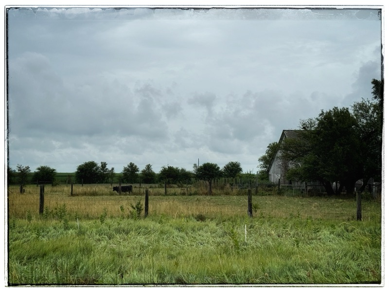 Now it is early morning. Overcast. Dark clouds above. The world an almost iridescent green and surprisingly chilly. the corn has grown inches in the last 24 hours.