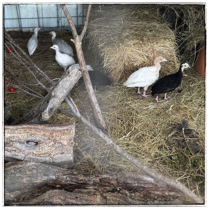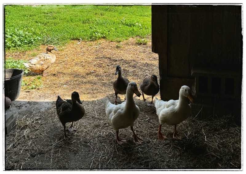 Those ducks are looking all grown up, but the turkeys still need some time. Those weeds are a real nuisance. I’ve got nasturtiums like that – they grow about 6 inches a day, but at least they look and taste good.