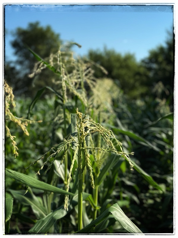 The sweet corn in the kitchens gardens are tasselling. Corn is self pollinating the tassels containing all it needs to germinate the cob below. 21 days to sweetcorn!