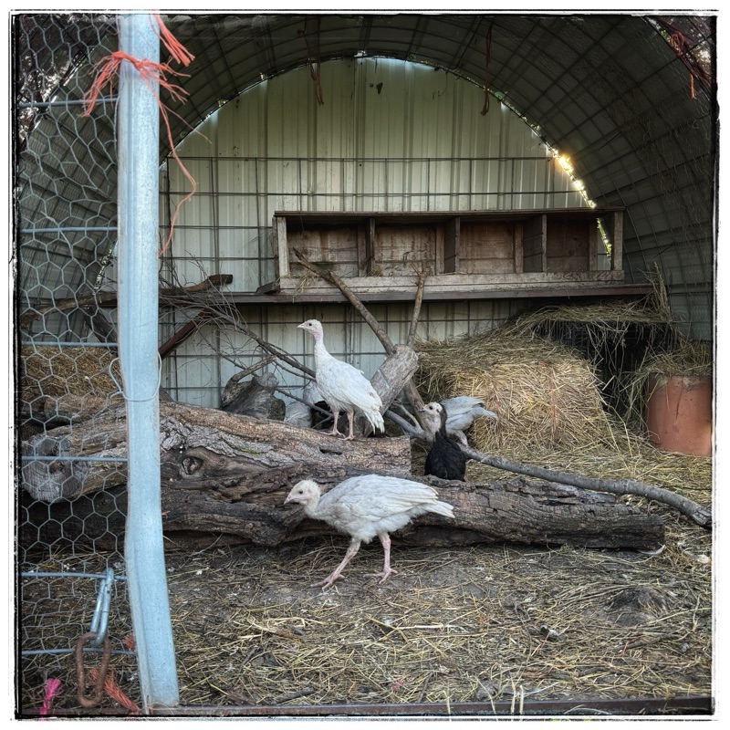 The turkeys put themselves to bed last night. I came out a little later than usual to herd them back to their house and they were already there!