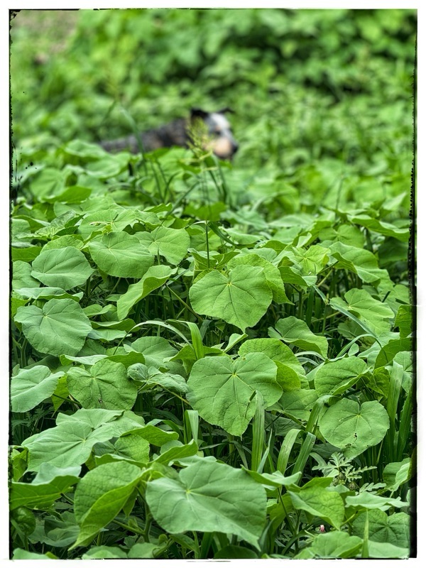 Today we begin to build the pig pen in earnest. And carefully so as to preserve the growth. The velvet weed will look like a tall dense jungle to the little black pigs. I am calling it shade. The PopPops will run around under this canopy and do very well I think. Once they start to forage I won’t need to be pulling weeds and grass (and cutting apples and bananas) to carry to them.
