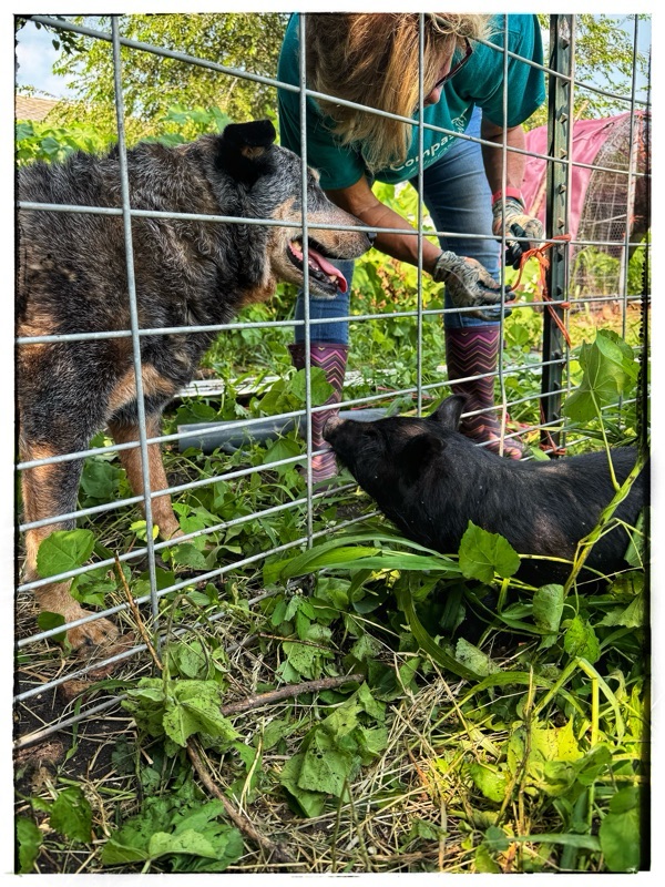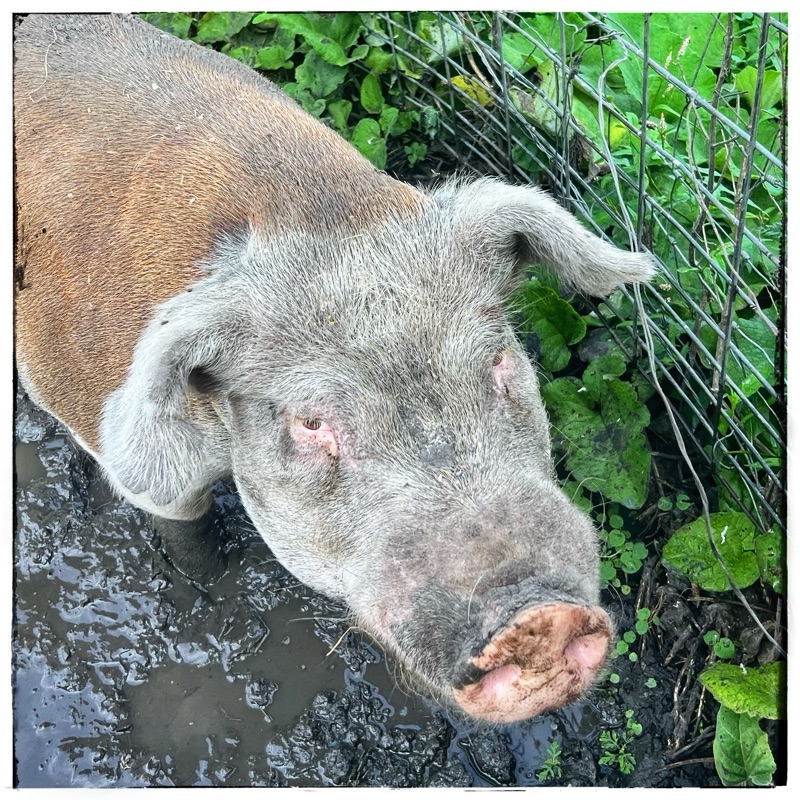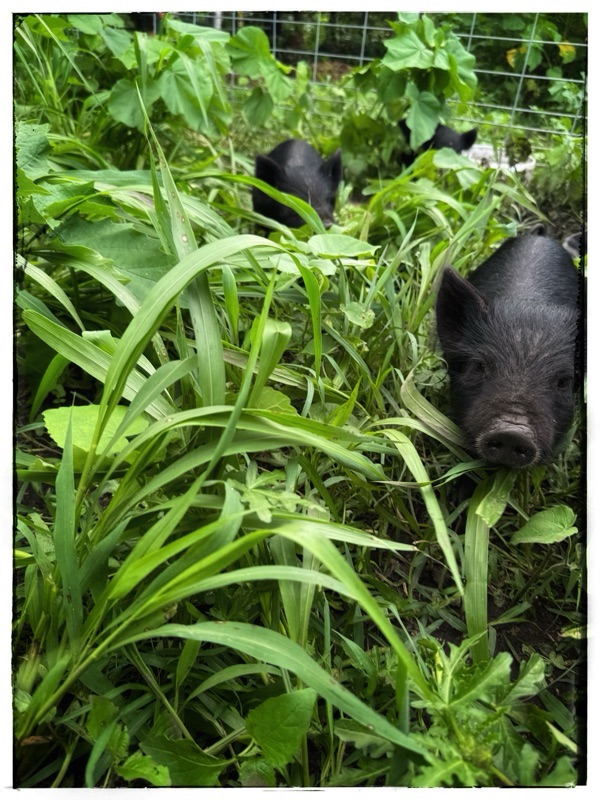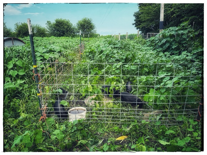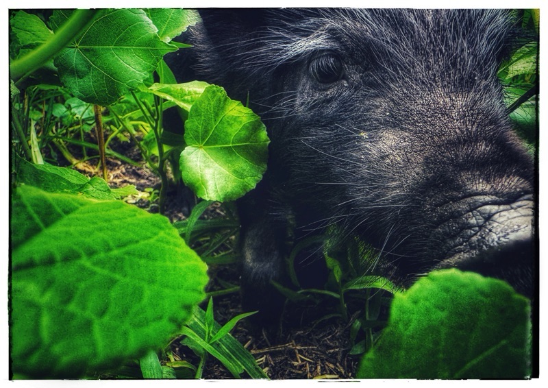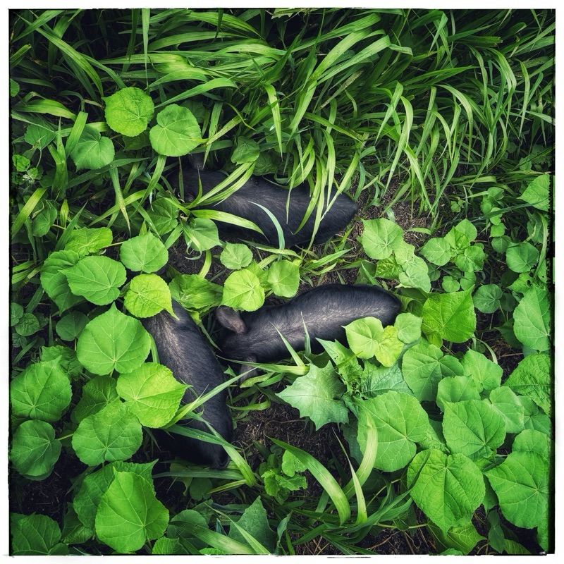 2. In the shot looking straight down on the little piglets nestled down in the new feeding area they look like some sort of big black melons! It’s good to flow into a plan B. So what that your imagined flowering pig garden didn’t happen! It is still being productively used and there is always next year for that flowering plan to materialize. It would have made a lovely picture.