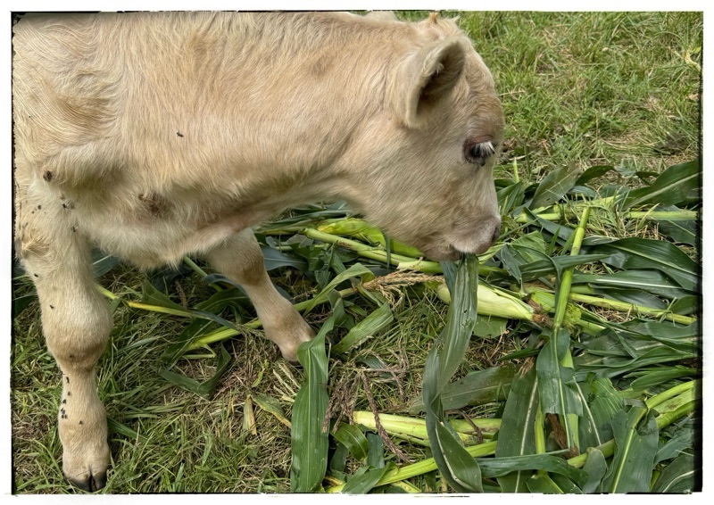 The sweetcorn has gone past the sweet stage so now I begin to chop the stalks (complete with corn) and throw the whole lot over the fence for the cows and the hogs. They eat everything.
