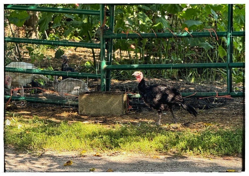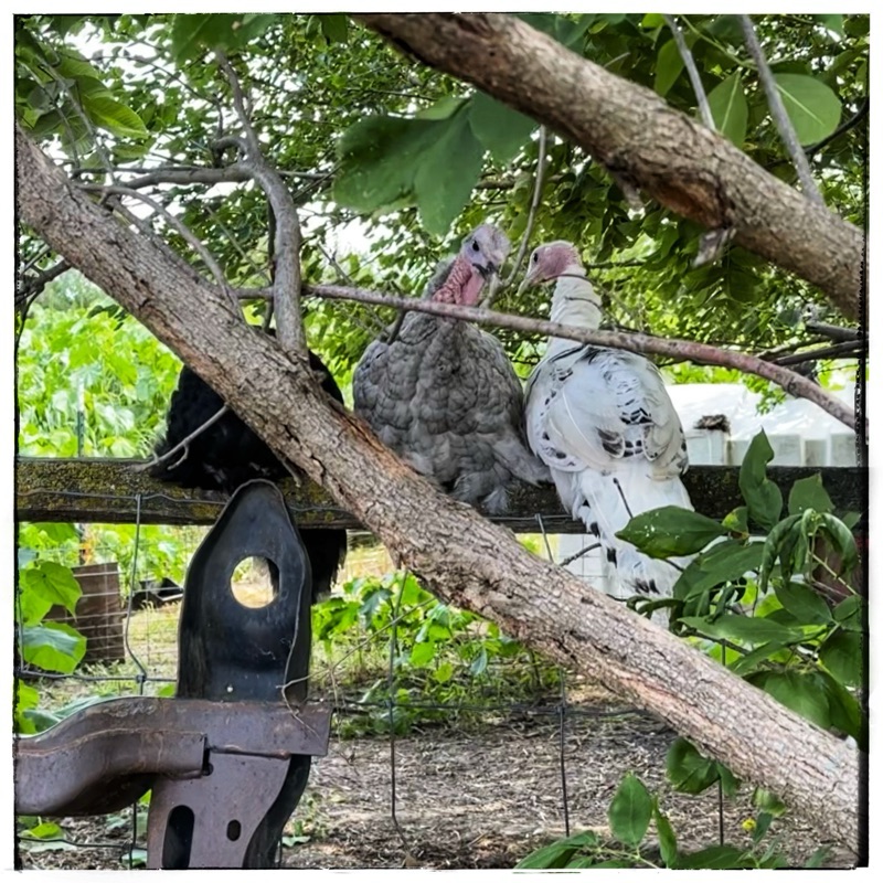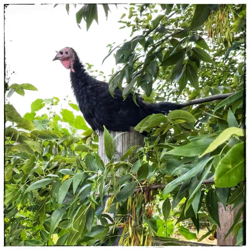 The turkeys flew up to sit on the fence a while during the day. Then back they went into the field. One turkey flew down into the driveway and the great outdoors resulting in frantic pacing from the lone turkey – she could not work out how to fly back up and over to rejoin the flock.