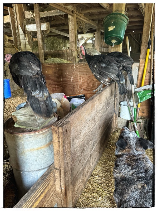 Boo is so helpful with training the turkeys where to sleep at night. But they came in the wrong door yesterday evening which upset his general sense of order. God knows they are going to make a mess in there.