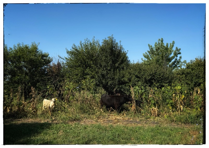 That is the old dairy master field that they share with the piglets. I supplement the cows with hay as the dairy masters field is quite deep with crimson clover. Where the crimson clover came from I do not know. Though not too good for bees (the pollen is deep in the flowers) crimson clover does have a microbial compound which is good for cows (and pigs) and is at 25% protein so I saved this field for late summer to fatten a beef who will go into the freezer.