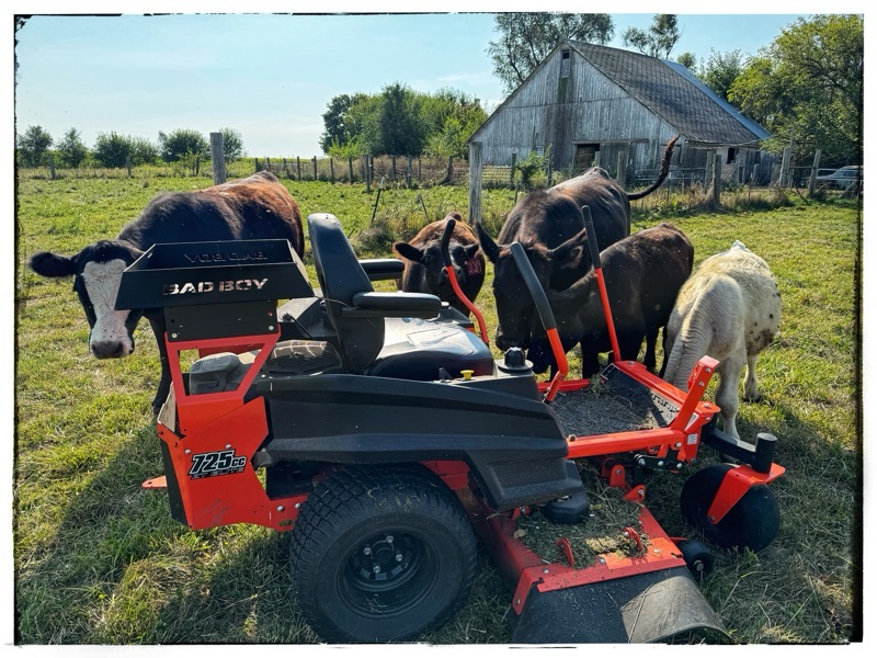 We have been so dry that the the grass is all brown tops and the thistles are at a perfect stage to be knocked down. My plan is that all the little thistle cuttings the mower produces will dry out before catching and regrowing themselves.
