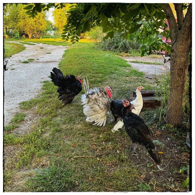 What a day of coordination and planning well done! Turkeys are known to have Very Little Brains – I had a friend whose family raised 100’s of them every year and swore that if they were caught in the rain, would stare up curiously with open mouths at it until they drowned – but are delicious and November isn’t far away.