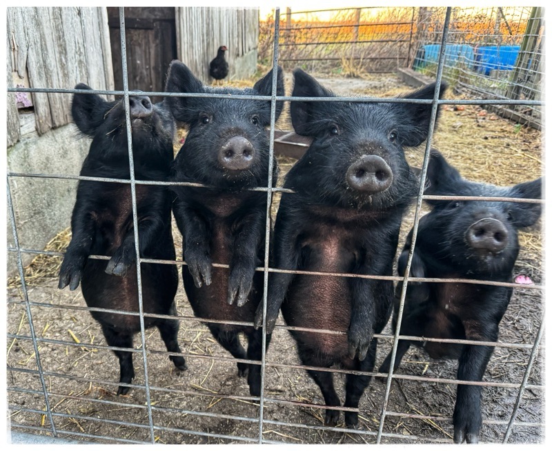 Such dear little pigs …and they don’t mind the poor old chicken!