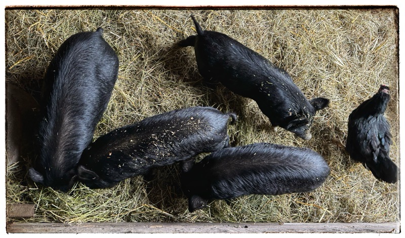 Four little pigs and their chicken. She is so brave this old girl. They make a delightful family.