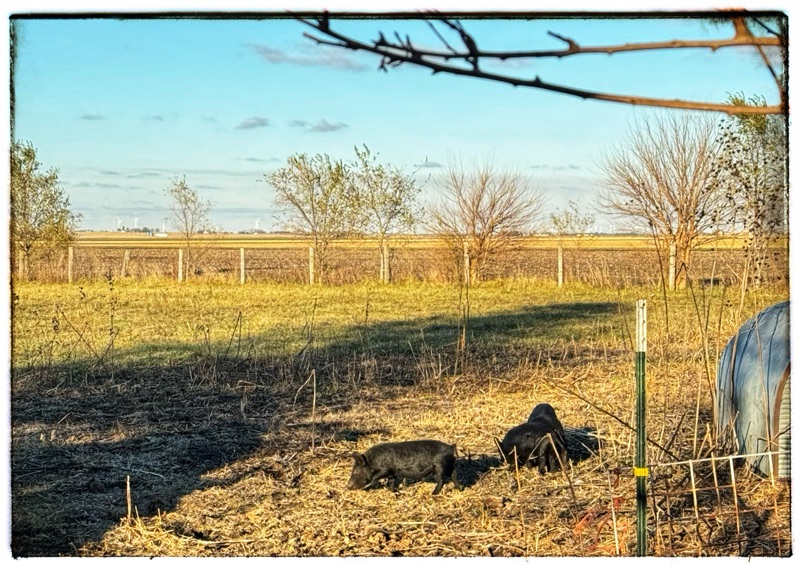 These two big pigs, Jude and FreeBee are doing a lot of grazing in the lovely weather we have been having. Eating as much grass as they can before the cold comes and nukes it all.