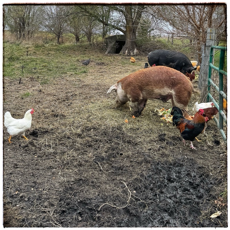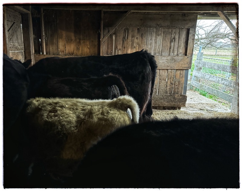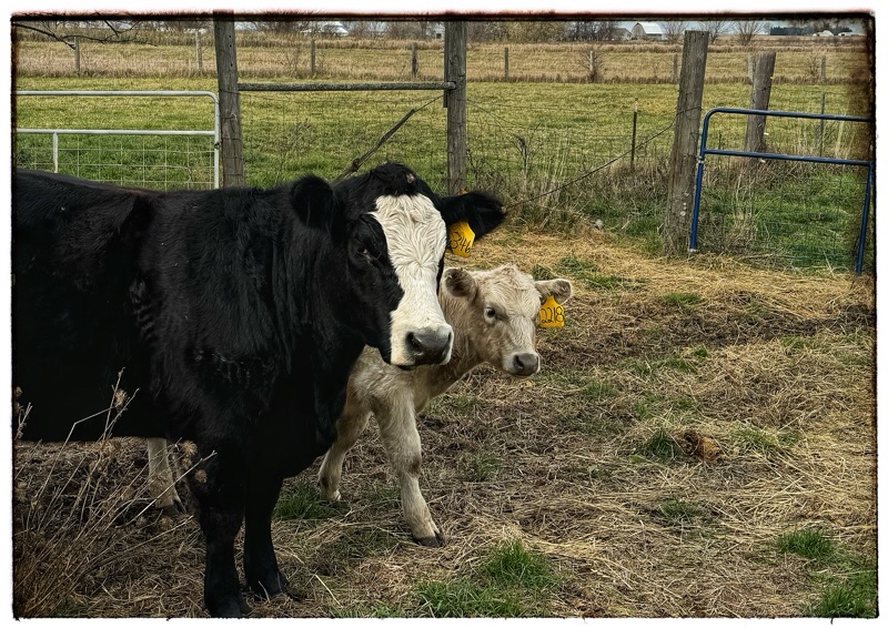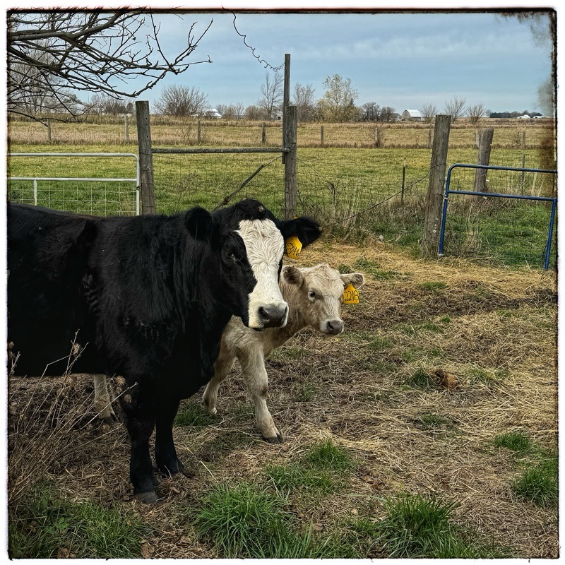 R and I had been talking as we were sweeping. She went outside to grab something. Popping her head back around the post she says. They are listening. The cows. Standing just outside listening to our voices.