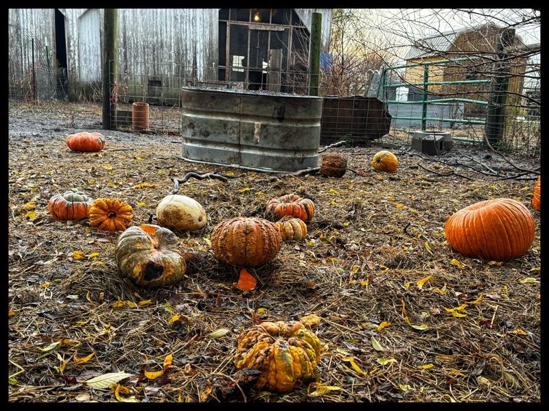 The cows are eating six or seven pumpkins a day. The pigs eat one between them. Even the chickens eat pumpkin!