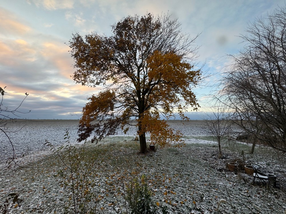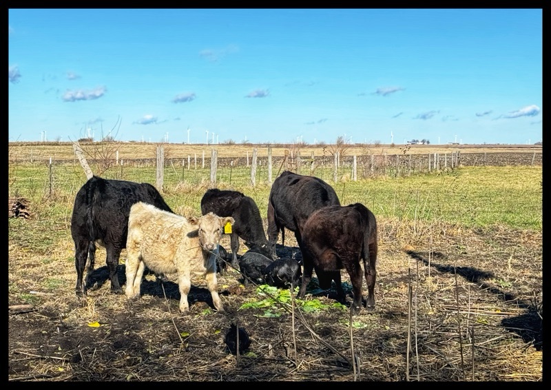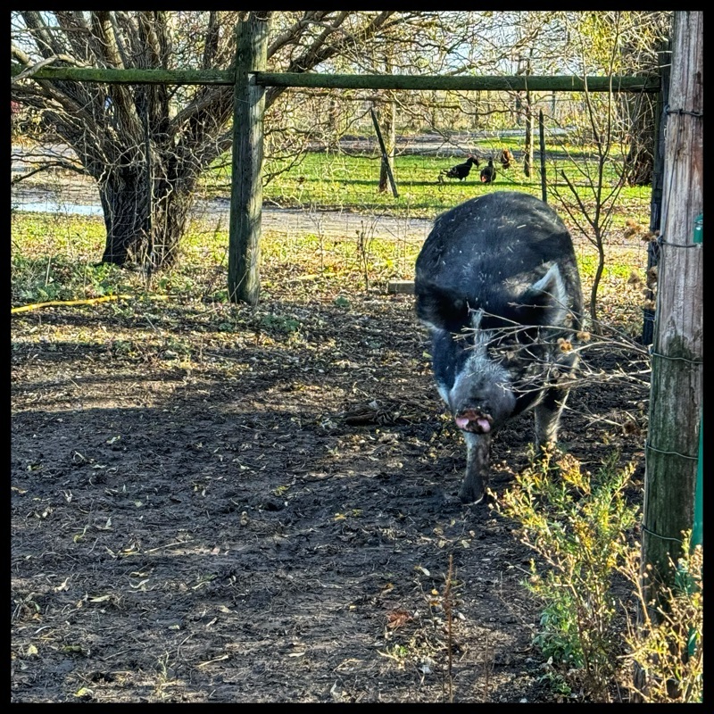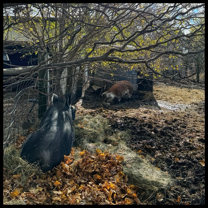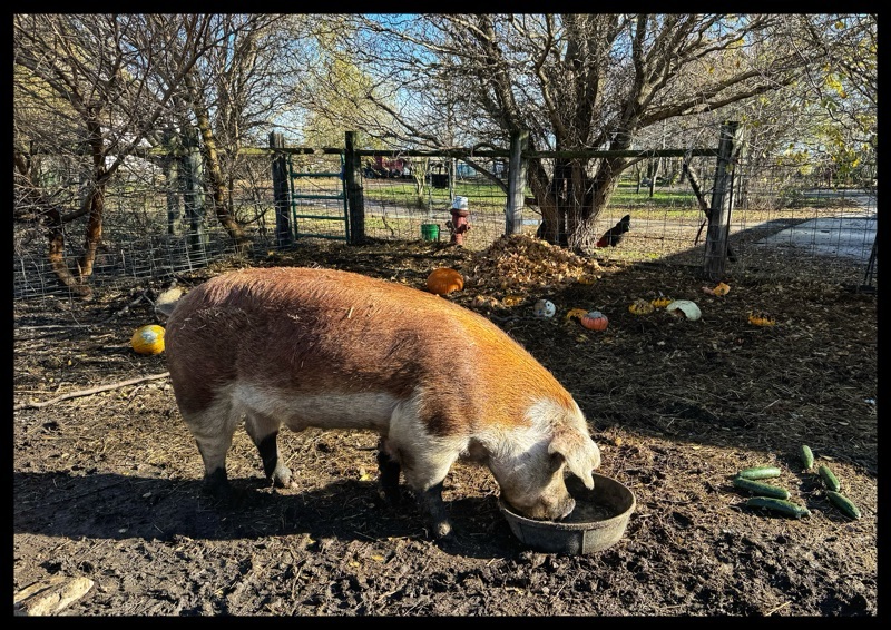 The big pigs are shifted into the enclosure closer to the house for ease of feeding and watering. Just in time, as it snowed last night with a bit more to come. Not much. But lots of wind.
