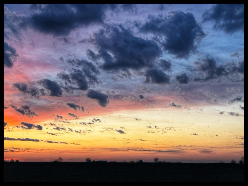 After months of clear weather the sky out here in central Illinois has turned sullen and leaden. Days of it. Right until sunset then the sun fans her elegant fingers into the gap between sky and low clouds and the world lilts into spectacular panoramic colour.