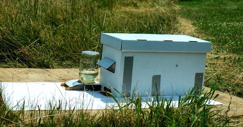 And as you can see the bees have slowly slowly been absorbed by the little cardboard Nuc.