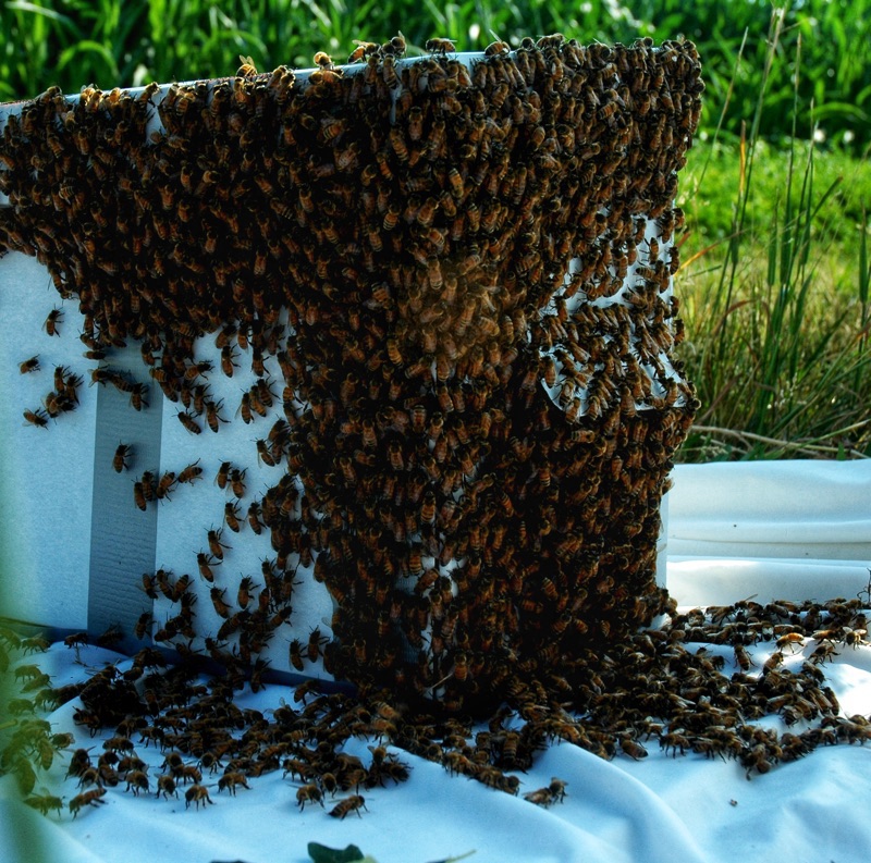 ANOTHER SWARM!.( the soundtrack of the day hits the LOW notes.)  However  (deep breath) this time I am ready. I only panic in a very mild way. Then I make up the little cardboard super that I bought last summer  (when I remember where I got it I will tell you), it is called a Nuc.  ‘Course now I have to convince them to move out of the wee oak tree and  INTO their little mini home. First I will take the passive route and allow them to decide to go in. Evidently if you put the box on a white sheet they see the little dark hole and walk right in. So I will make the offer. Mm.  Well  my plan is that the little scout bees will be flying about, then they will look down and “Wow look at that piece of real estate, it even smells good and there is a feed waiting  woo hoo.” They  will fly back to Old Miss the Queen sat up there all Queenly like in her oak tree her bee minions fanning her to keep her cool. The Scouts will do the  Waggly – ‘Found us a new pad’  Jiggly dance, everyone will agree in record time and later this afternoon they will pick up their beds and walk right in. Single file would be pretty!?