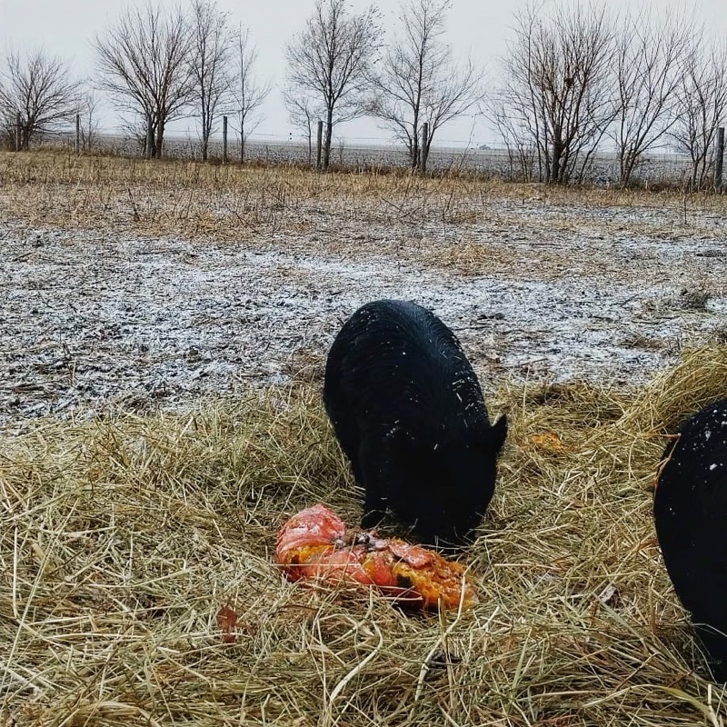 The PopPops are the clean up crew helping to clear up the cows pumpkins. They are no longer torpedoes shaped – they are starting to look like black rugby balls on the run!